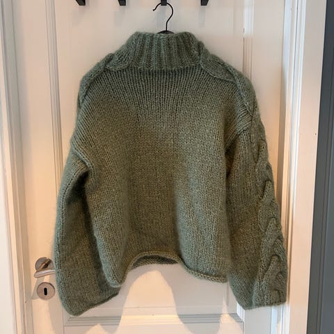 Hjemmestrikket, god, varm og myk ullgenser i koksgrå med legger rygg og to knapper i perlemor.