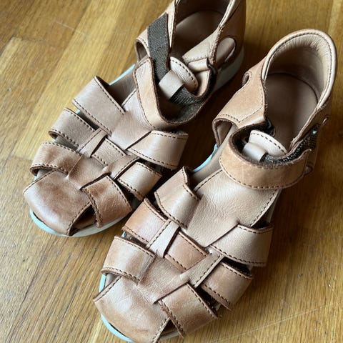 Sandalene har borrelås for enkel justering og lukking. Sålen har godt mønster for grep.