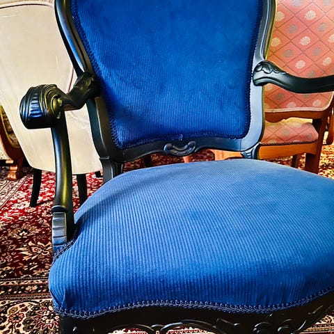 Fin rokokko stol selges. Har stått i dyre og røykfritt bolig. Minimalt med slitasje fra tiden stolen var i min oldemors eie, men har i senere år kun stått som pynt. Alle fjærer intakte. Høyre hjul fremme er løst, men sannsynligvis enkelt å fikse hvis ny eier ønsker det.