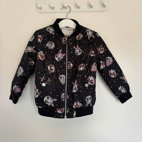 Lindex barnejakke i størrelse 98/104, brun farge med mønster av katter og blomster. Jakken har glidelås foran og ribbestrikkede kanter ved hals, ermer og nederkant. Egnet for barn i alderen 2-4 år.