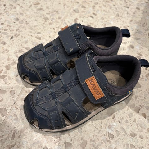 Kavat barn sandaler for unisex, størrelse 31. Sandalene er laget av brunt lær og har en lukket tådesign med borrelås for justerbar passform. Noe slitt på utside heler, se siste bilde.