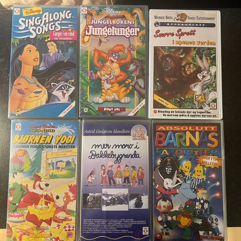 Selger en gammel VHS-samling da den kun tar opp plass. 34 filmer for barn, ungdom og voksne.