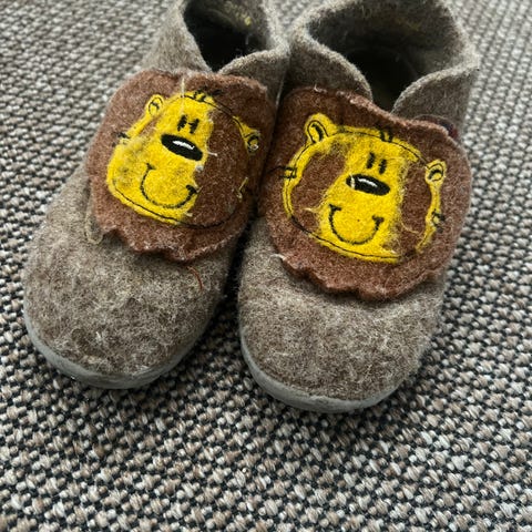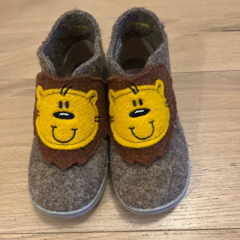 Superfit barne tøfler i størrelse 22, unisex modell. Tøflene er brune med et dekorativt løveansikt på toppen. Laget av filtmateriell med gummisåle som gir godt grep. Egnet for innendørs bruk.