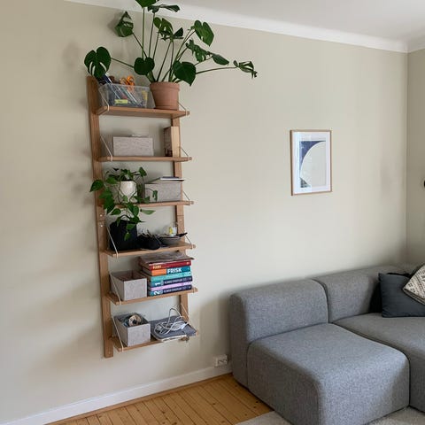 Selger ett skap, to hyller og ett veggfeste til retro hylle av dansk design.
