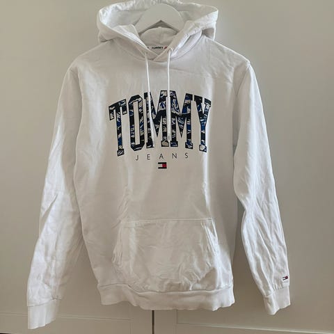 Tommy Hilfiger Hoodie i størrelse S, mørkblå farge. Genseren har hette med snøring og frontlomme. Passer for barn/ungdom. Svært pent brukt.