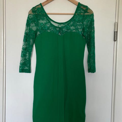 Kjole fra Noella som jeg aldri får brukt. Den er sydd litt inn i livet av sydame for finere fasong. Størrelse S. Veldig fin grønnfarge. Behagelig underkjole. Gjennomsiktig stoff på armene.