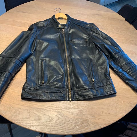 Svart vintage skinnjakke med røde detaljer fra Hard Rock Café. Jakken er laget i et deilig mykt skinn og har brodert logoen inne i nakken på jakken. Kule detaljer på glidelåsene. Kort krage.
