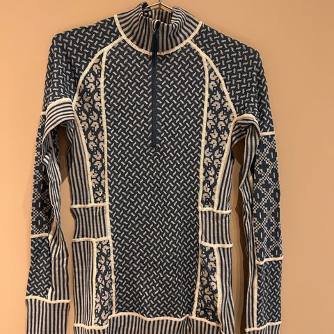 Ullgenser 100 prosent ull fra Kari Trå selges. Fargen er blå flerfarget.