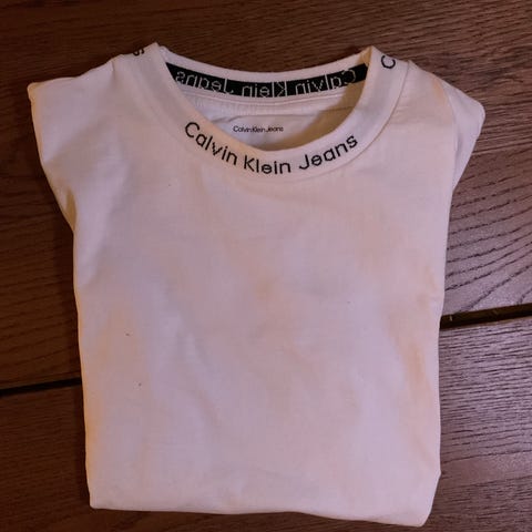 Calvin Klein Jeans langermet genser i hvit farge, størrelse 4 ar. Genseren har en høy hals med Calvin Klein-logo og er laget av mykt materiale. 98%bomull brukt en gang som ny