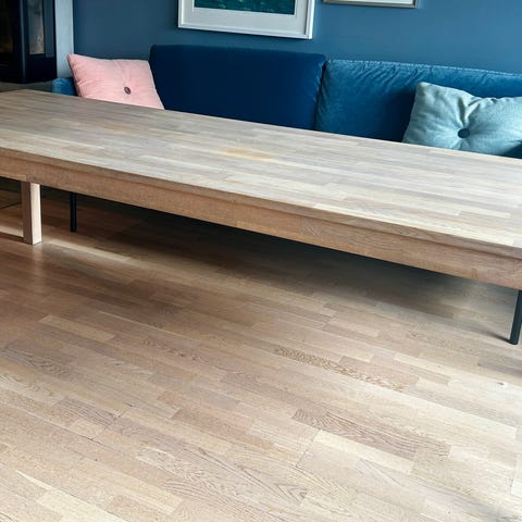 Eksklusivt Bolia spisebord laget i heltre eik med ben i samme materiale. Bordet har en rektangulær form og en naturlig trefinish. Passer til spisestue eller kjøkken. Ingen synlige bruksmerker.