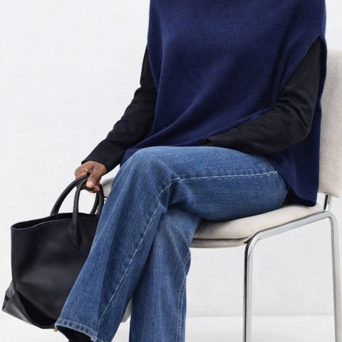 Den har ingen tradisjonelle ermer – ponchoen kan brukes over en langermet topp f.eks. i samme farge som gir et lag-på-lag-uttrykk. Evnt en kontrast-farge.