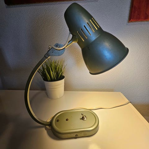 Har en flott patinert lampe fra designer Jac. Jacobsen i herlig grønn farge tilsalgs. Ingen bulker eller store riper, men er synlig at den har levd. Jeg har ikke vasket den grundig så den kan nok gjøres renere, men super sjarmerende som den er. Den har det gamle ugjordede støpselet så får ikke tatt bilde av at den lyser her, men testet den i det gamle huset jeg hentet den i og da virket den. Litt løs i selve festet til hodet, se siste bildet. Kan brukes som både vegghengt eller bordlampe. Denne leter etter en koseplass i et retrohjem ☺️