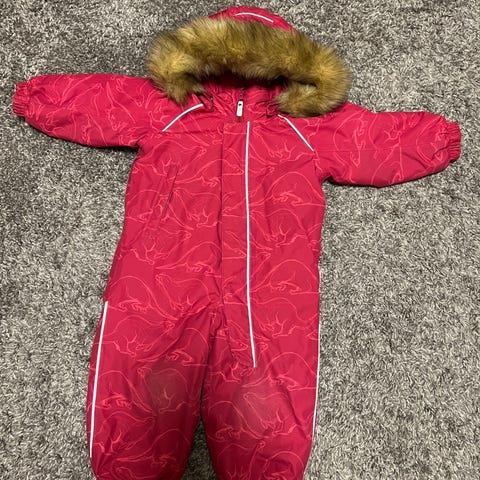 Vinterdress fra Reima, str 86, rosamønstret. Strikk på begge føtter og under sko for god passform og komfort. Avtakbar hette. Refleksdetaljer. Vært brukt primært første år i bhg, vært impregnert x2 og vasket et par ganger.