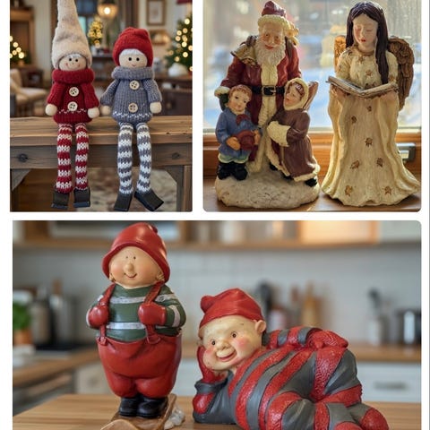 De to hvite juletrærne er egentlig med lys, men er nok finest/best uten. Både fordi det er litt ustabilt med batteriene inni og at lokket på det minste er knekt og må lirkes opp.