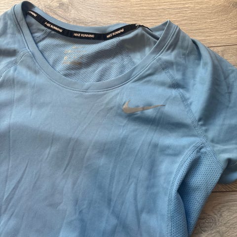 Nike Running T-skjorte i størrelse XS, designet for løping. T-skjorten er rød og laget med Dri-FIT teknologi som bidrar til fukttransport for bedre komfort under trening. Materialet er lett og pustende, egnet for kvinnebruk.