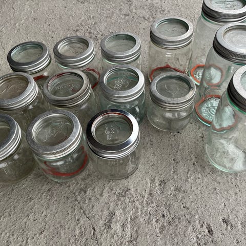 Flotte Norgesglass i ulike størrelser/med lokk/alu/ring.Noen strikker-Alle i fin stand.Det store Løveglasset(blålig)rommer 2l-bud