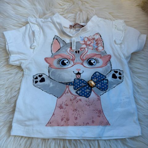 langermet T-skjorte i størrelse 104 for jente. T-skjorten er hvit med et hjerteformet mønster av rosa og røde blader på fronten. Materialet er mykt og egnet for barn. Bomull
