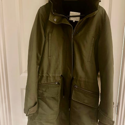 Selected Femme style Narah trenchcoat F i str. 38. Den har en langermet teddy innerjakke / fôr som er festet med trykknapper og som kan tas av og brukes som egen cardigan. Dermed blir denne vintervarme trenchcoaten til en sommer trenchcoat (se de to siste bildene). Både trenchcoaten og innerjakken har hette. Brukt noen få ganger og har ingen skade.