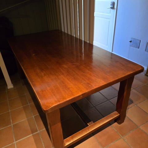 Helt og pent spisebord med seks spisestoler. Er litt bruksmerker. Har vært profesjonelt lakkert og oljet en del år tilbake. Ene stolen er blitt pusset ned på setet. Må evt oljes opp på nytt.