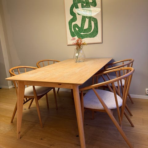 4 stk spisestoler i eik selges kr. 100 pr stk., eller samlet kr. 300. Pent brukt.