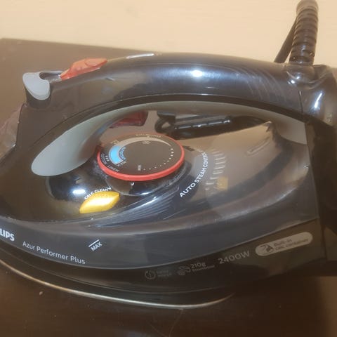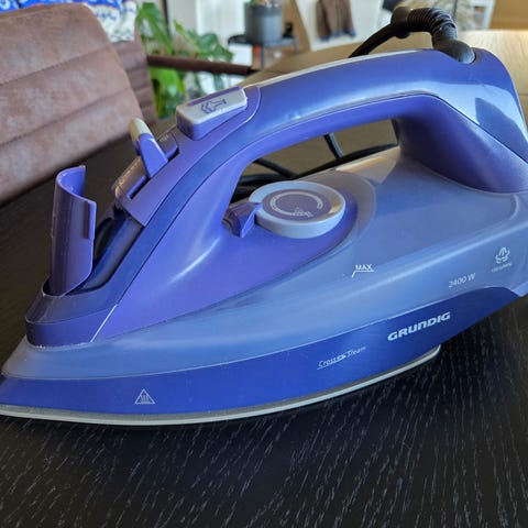 Bosch Secure Dampstrykejern med en effekt på 2000 watt. Strømbryter og temperaturkontroll med justerbar termostat. Strykejernet har en grå farge og en metall såle med damphull. Passer for vanlig stryking av tekstiler.