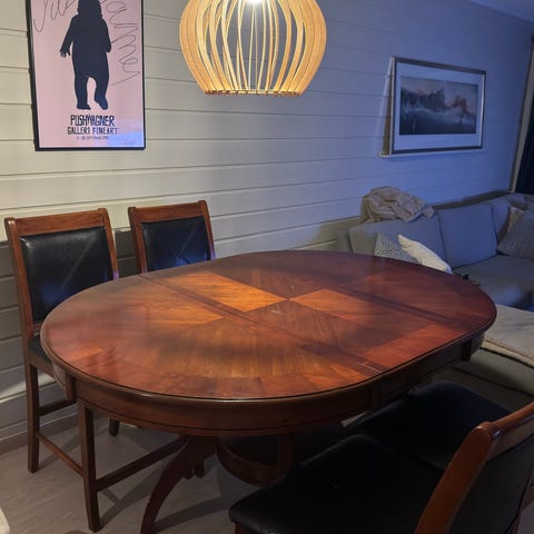 Et flott bord med 8 stoler selges. Bordet er lagt ut for en stor familie og kan brukes til 2-4 personer hver dag. Siden lengden er fra 160 cm til 220 cm. Dessverre har bordet og stolene tegn på å bruke en katt, som vist på bildet. 4 stoler uten tegn på bruk, 4 sTegn på bruk. Bordet er tungt og har utmerket stabilitet. Ikke kjent.Maks lengde. 220 cm