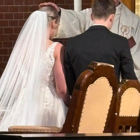 Selger det vakre sløret jeg brukte i bryllupet mitt.