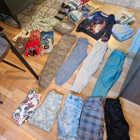 3 tynne gensere, en tykkere genser, en singlet, en bukse og en sort vest til pent brukt.