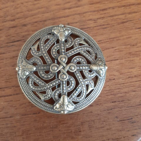 Kalevala Tradisjonell Spenne laget av bronse. Designet for damebruk, med et unikt og dekorativt mønster. Spennen har en lengde på omtrent 7 cm, og kan brukes til å feste klær , skjerf eller som et dekorativt tilbehør. ( se bilder) - sender gjerne med posten Bring ikke med fiks ferdig!