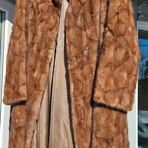 Lekker pelskåpe/jakke. Tror det er mink. Lengde kåpe ca 115 cm og jakke ca 70 cm. Glidelås (se bilde). Avtagbar pynt på ryggen