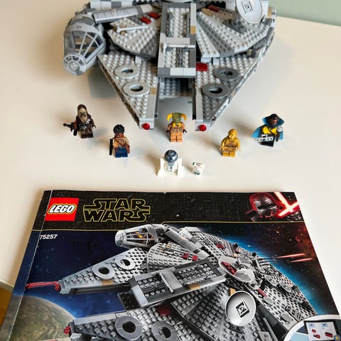 LEGO Star Wars Millennium Falcon byggesett med detaljerte deler. Settet inkluderer instruksjonshefte og representerer romskipet Millennium Falcon fra Star Wars-universet. Passer for samlere og byggere.
