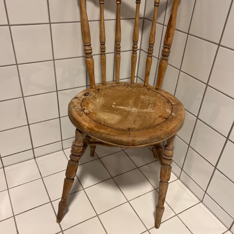Litt sliten stol fra Nässjö. Selges til inntekt for Dyrebeskyttelsen