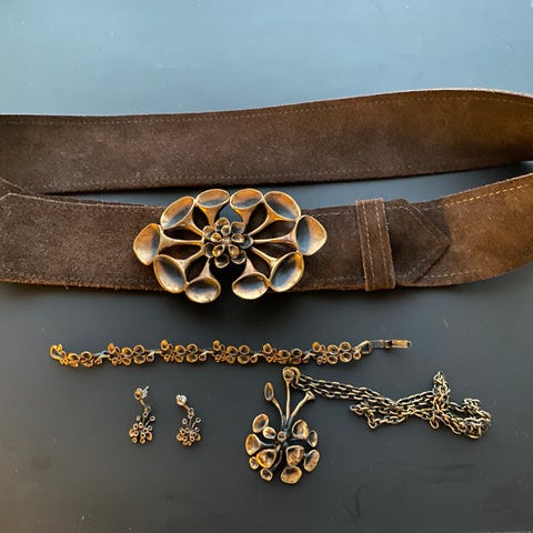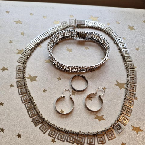 smykkesett for dame, laget i sølv og turkis krakelere sten og glass . Settet inkluderer en brosje med turkis stein, et par ørepynt med matchende turkis steiner, og et kjede. Smykkene har en dekorativ design med turkise detaljer som fremhever materialets tekstur og farge. - Dette er et modernistisk og håndlaget sett brosje og øredobber m/ klips fra 1963 laget av « Ulla Fock» Sverige . - Brosjen er signert på baksiden . - Se bilder . - sender gjerne med posten bring men ikke med fiks ferdig