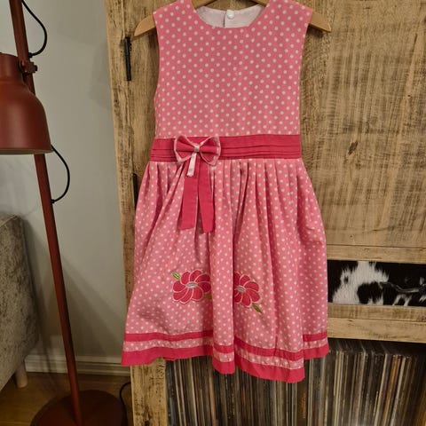 Nydelig retro kjole, rød og hvit, med applikasjon foran og knyting bak. Str. 98/104