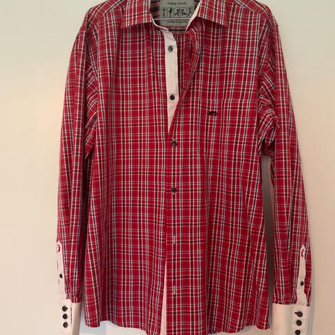 Pent brukt Lorang by Zeno herreskjorte i klassisk rutemønster med røde, blå og hvite toner.