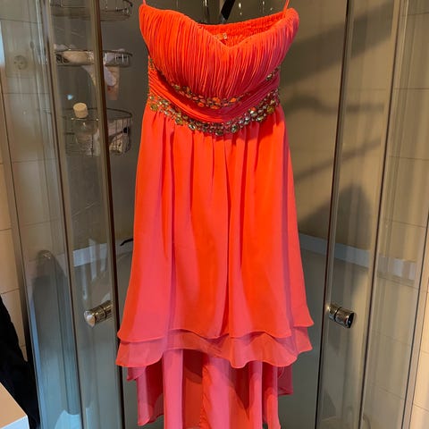 Stroppeløs ferskenfarget kjole kjøpt på Nelly selges. Strassbelte i livet og skjørtet er kortere foran. Jeg har brukt den i et par bryllup for 10 år siden. Nå er vennegjengen godt gift, så jeg trenger den ikke lenger.