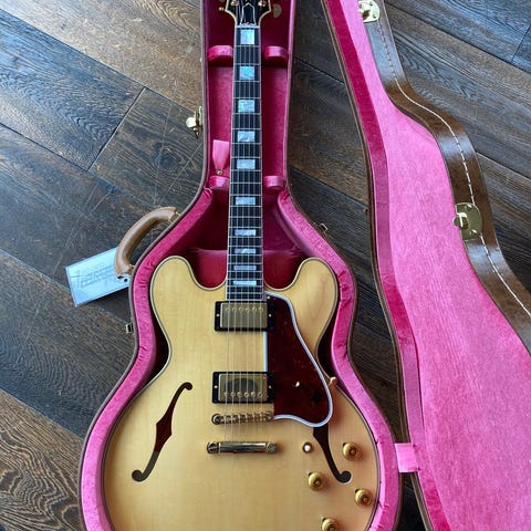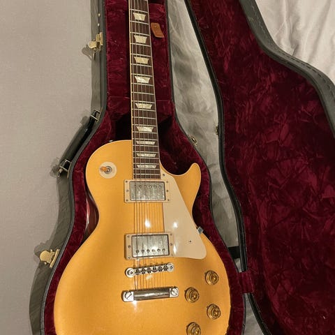 Gitaren har også en fantastisk flammetopp som er sjelden å finne på R8. I følge internettet (igjen) hadde Gibson tidlig på 2000 tallet for mange av de fine toppene som ble brukt på R9, så da ble en del av dem brukt i R8. Stemmer/ stemmer ikke, men den er i hvert fall nydelig. Gitaren har vært flittig brukt, så litt bruksmerker og arr er det her og der, men ingenting graverende. Kommer i original Custom-Art-Historic kasse.