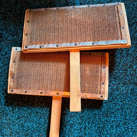 Usikker på akkurat kva dette er for noko. Har tydeligvis noko med karring av ull å gjere. Ullkarre, grovkarre, blandebrett for ull?. Uansett……Gi gjerne bud!