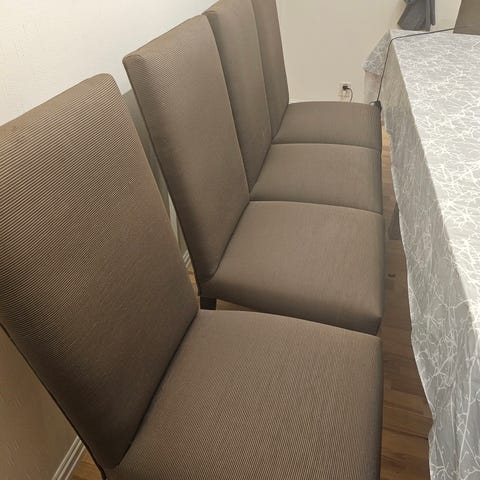 4 stoler som er godt brukt. Har katt så de har blitt litt klort opp. Trekket kan tas av, vaskes og byttes ut.