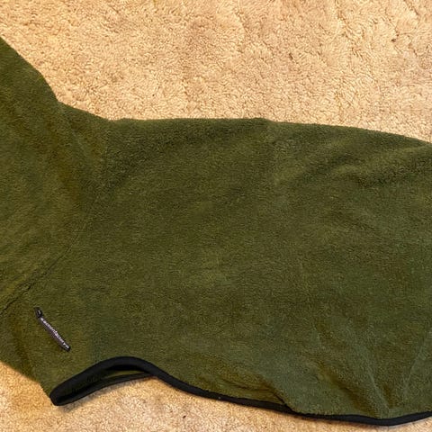 Hundedekken i merket Hurrta. Brukt av en liten hund på ca 7 kg. I følge lappen inne i jakken er str 30 cm så burde passe andre små hunder som bruker den str. Dekkenet har fleece stoff på innsiden og rutete gult mønster rundt kragen.