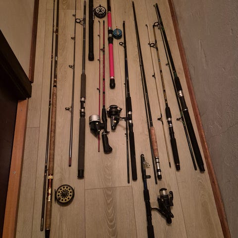 Har endel fiskeutstyr som skal bort. Har byttet ut den ene stanga med en annen en. Den som er nest nederst på bilde en.