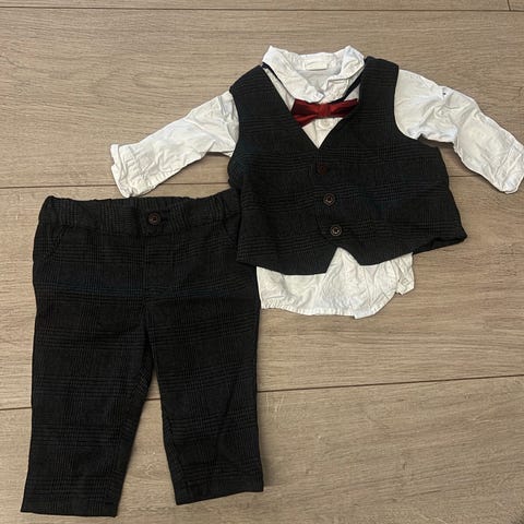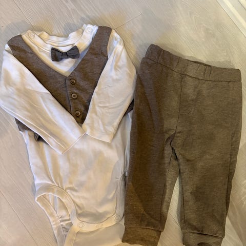 Veldig søt "dress" til baby. Perfekt til en hver anledning der man skal pynte seg litt. Den er i tillegg veldig praktisk da det er en heldress med bleie åpning. Også en veldig søt avtakbar sløyfe. Pent brukt. Størrelse 68.