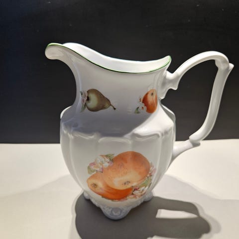 porselensservisset bestående av en stor skål, en mugge og en bolle. Alle deler er hvite med dekorative gullfargede detaljer. Designet med klassiske mønstre og buede former.