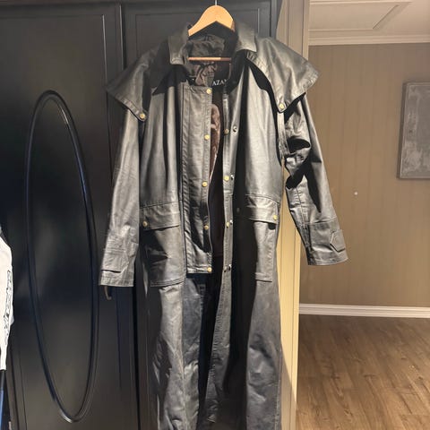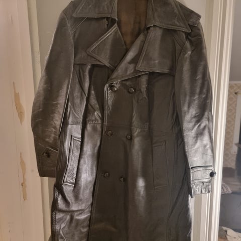 En svart herrefrakk i skinn fra rundt 1940-1950-tallet.