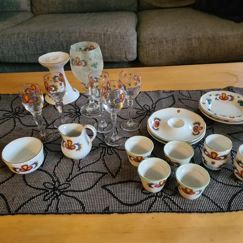 Bondemønster servise, fat, sukker&fløte, eggeglass etc