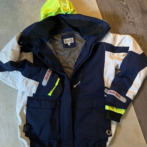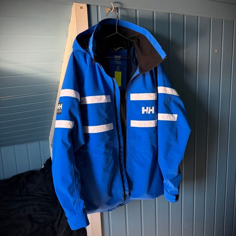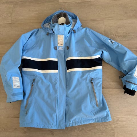 En lyseblå fôret allværsjakke fra Helly Hansen selges. Jakken var ny i 2005, er lite brukt og i fin stand.