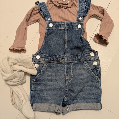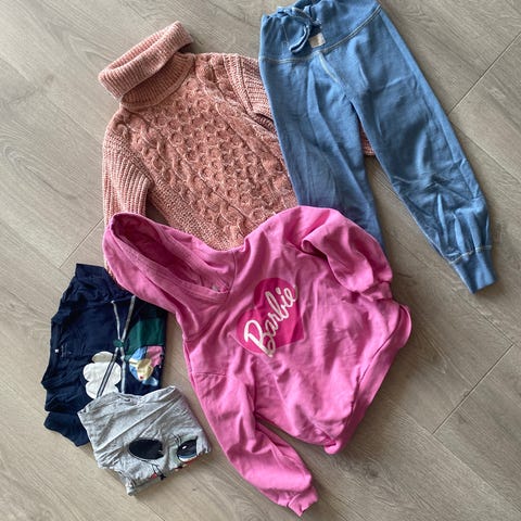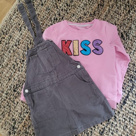 Fint brukt, liten klespakke 😊 Inneholder som på bildet: en hettegenser, en tights og et dongeri skjørt med seler 😊