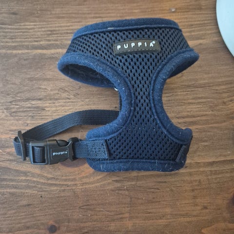 Lite brukt Puppia XS sele laget av svart mesh materiale. Designet for små katter eller hunder med justerbare stropper for komfort og sikkerhet.