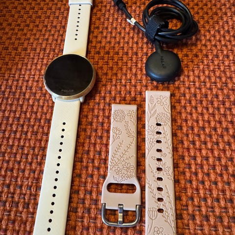 Polar Ignite 2 Smartklokke med rund skjerm, beige silikonrem, og unisex design. Klokken har funksjoner for helseovervåkning, trening og daglig aktivitetssporing.