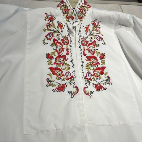 Ny skjorte med broderier i mørk og lys fiolett og grønt. Passer meg som normalt bruker str 36